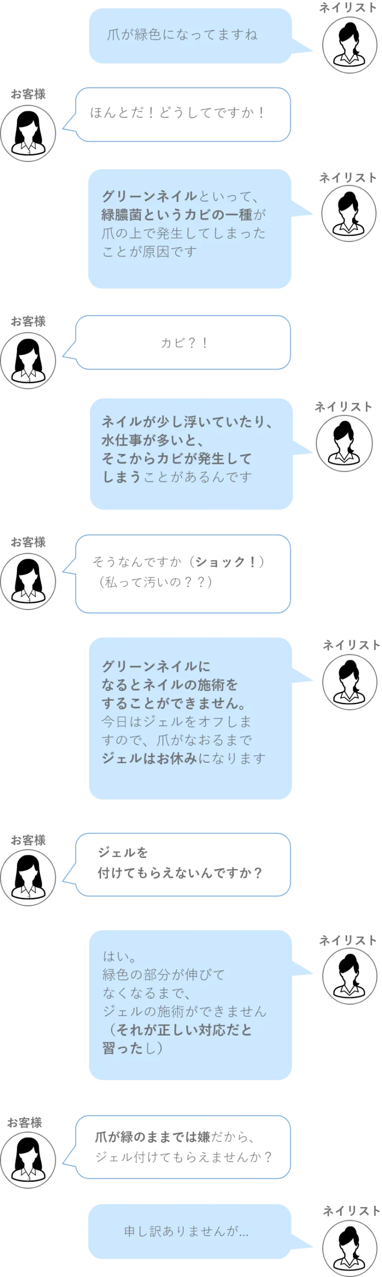 これまで、お客様の爪が緑色に変色していた場合、ネイルサロンではこのような対応を取るのが一般的です。