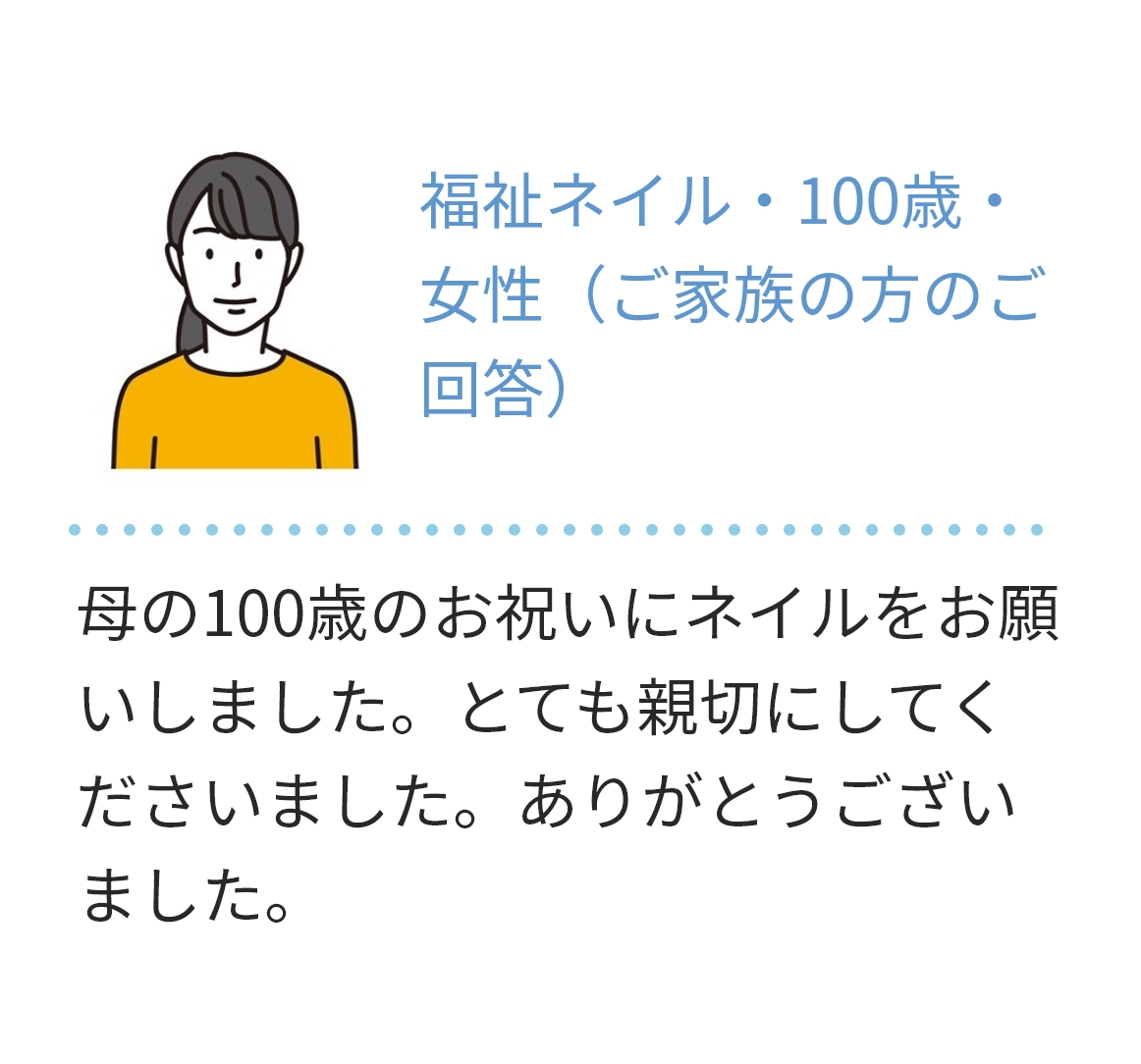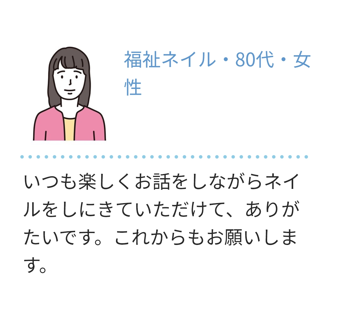 美容に気を遣うことでQOL、意欲、社会性向上などの与い影響が認められています。自分へのご褒美に、ご家族様へのプレゼント、お祝いなどの記念に!日本保健福祉ネイリスト協会又は、介護美容スクール及びその他専門スクールの有資格者がご訪問します。回想法などを用いて、優しく目を合わせ、お話をしながら施術いたします。