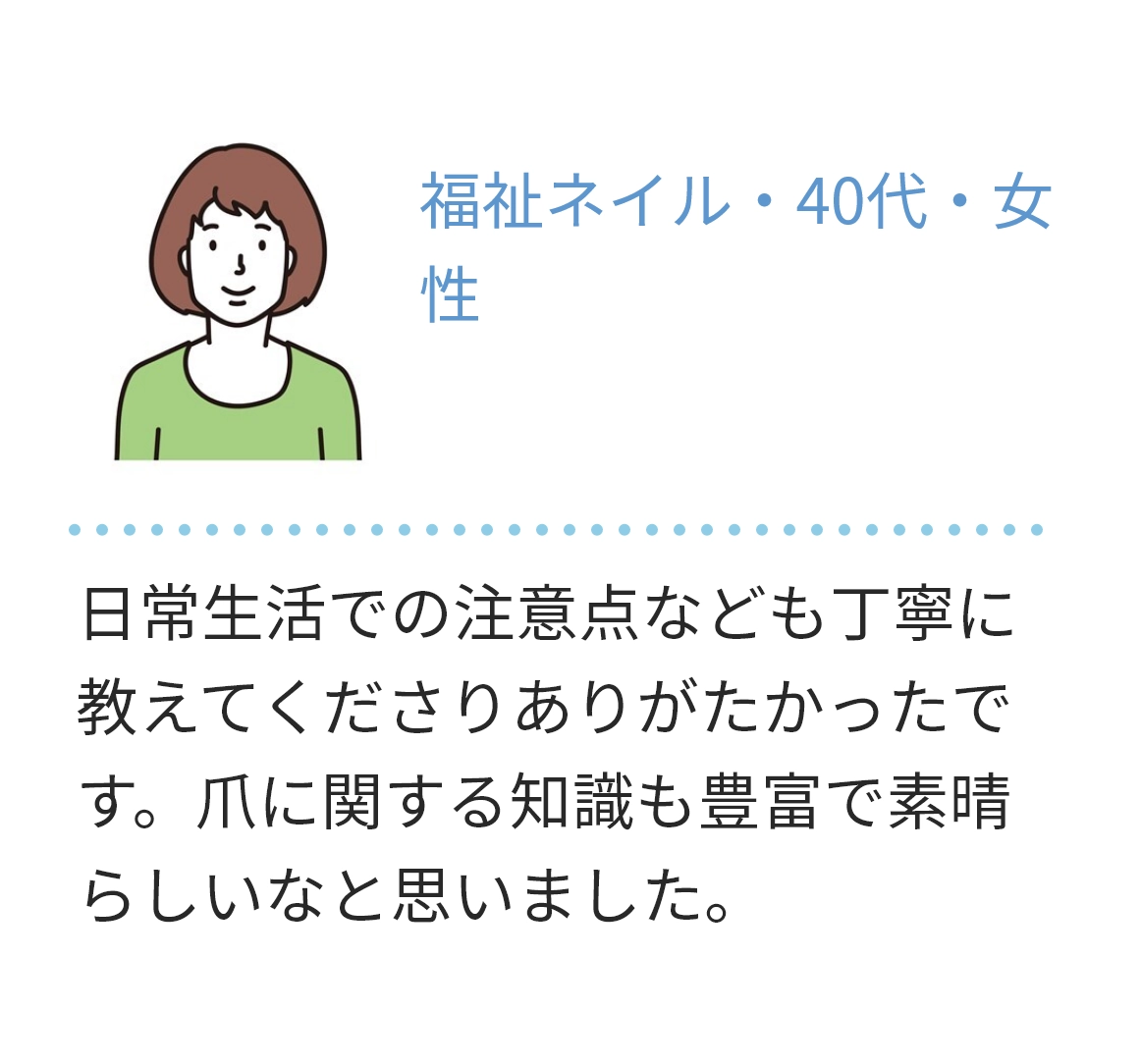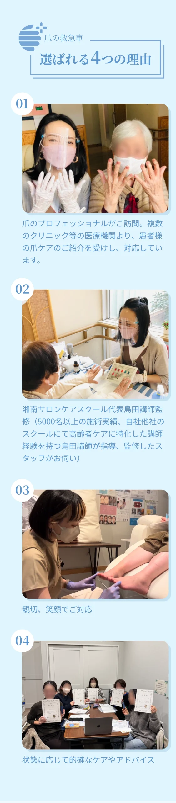 爪のプロフェッショナルがご訪問。複数のクリニック等の医療機関より、患者様の爪ケアのご紹介を受けし、対応しています。