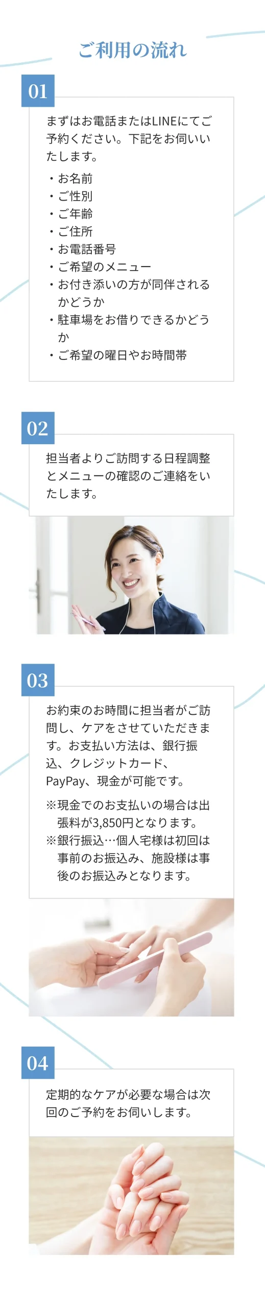 お約束のお時間に担当者がご訪問し、ケアをさせていただきます。お支払い方法は、銀行振込、クレジットカード、PayPay、現金が可能です。